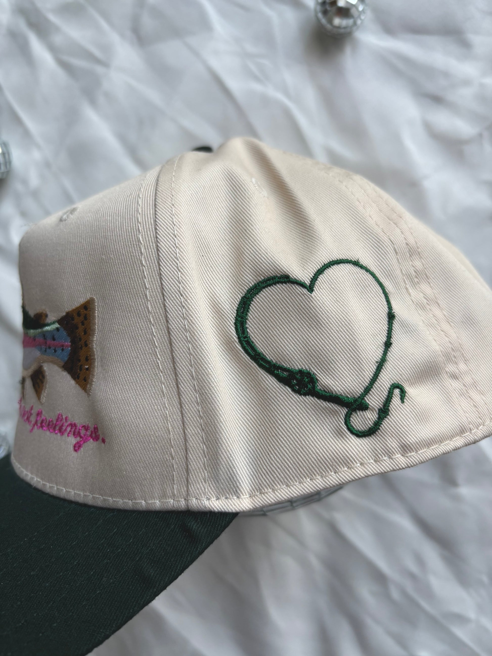 This Catching Fish, Not Feelings trucker hat is perfect for fishing lovers, lake days, and anyone who appreciates a little humor with their outdoor style. Featuring a beautifully embroidered trout and playful pink lettering, this hat is both eye-catching and comfortable.
