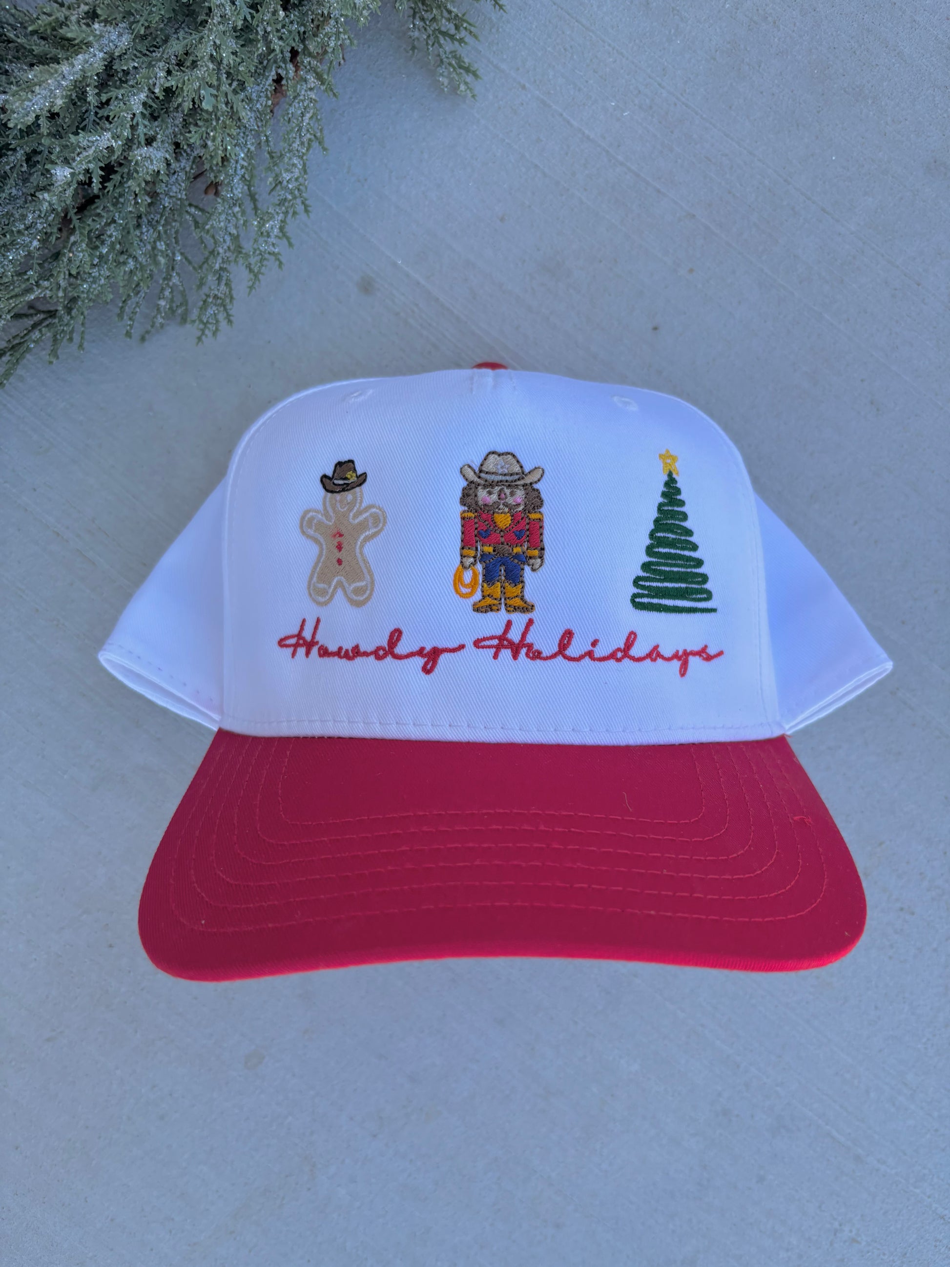 Bring a little Western cheer to the holiday season with our festive Howdy Holidays trucker hat! Featuring embroidered designs of a cowboy gingerbread man, a rodeo nutcracker, and a Christmas tree, this hat perfectly blends holiday spirit with country charm.