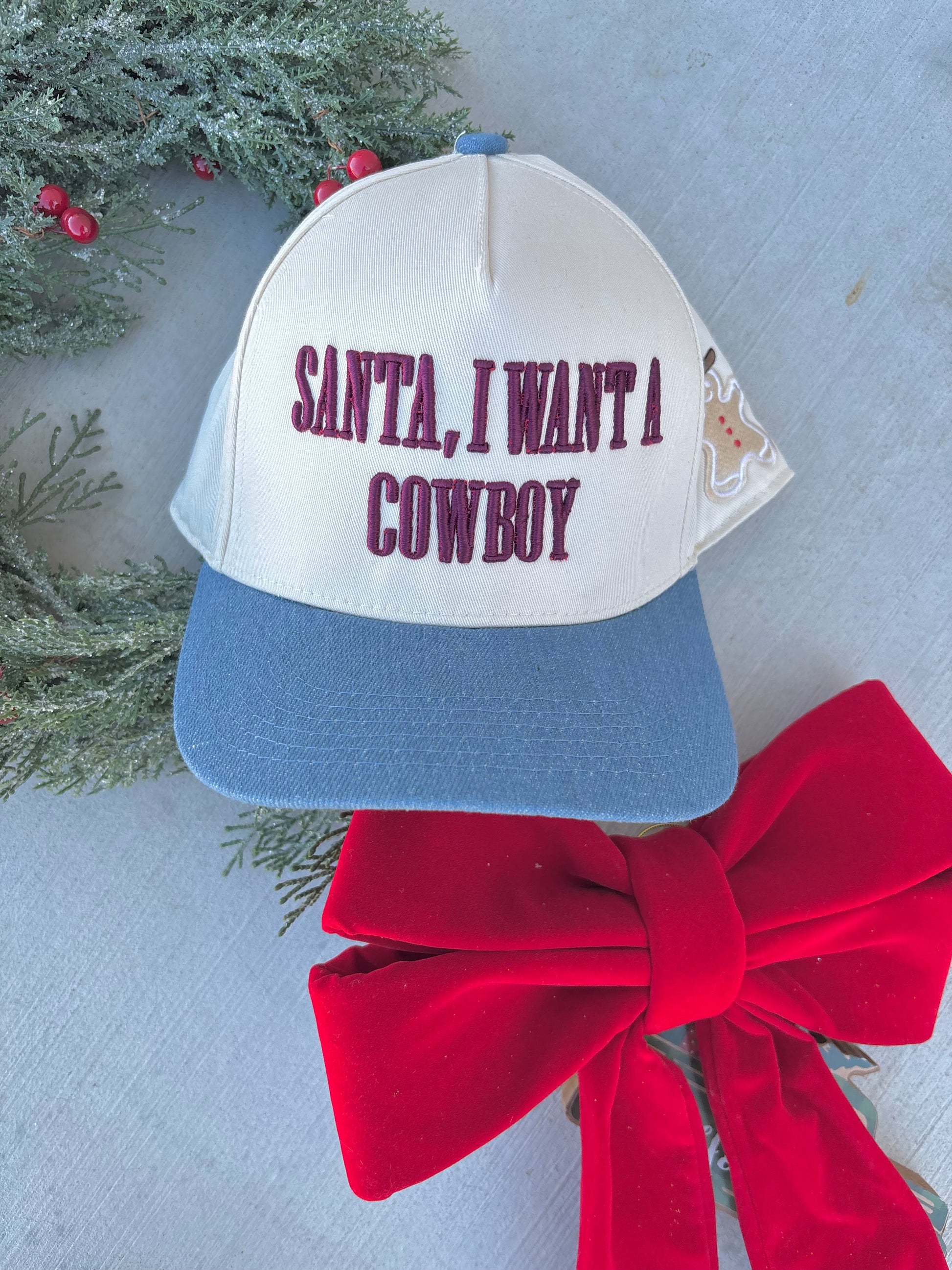 “Santa, I Want a Cowboy” puff embroidered in deep red thread